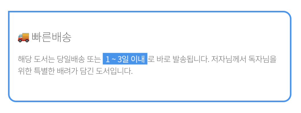 바로출고 서비스 등록으로 더 많은 분들이 빠르게 책을 받아보실 수 있게 되었습니다. 부크크 서점에서는 이러한 바로출고 서비스가 바로 적용되며, 며칠 내로 예스24, 알라딘과 같은 일반 온라인 서점에서도 일반 책을 주문하는 것과 똑같이 2~3일 내로 책을 받아보실 수 있습니다.
